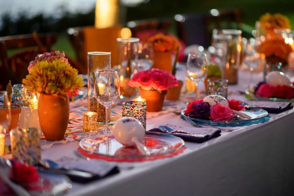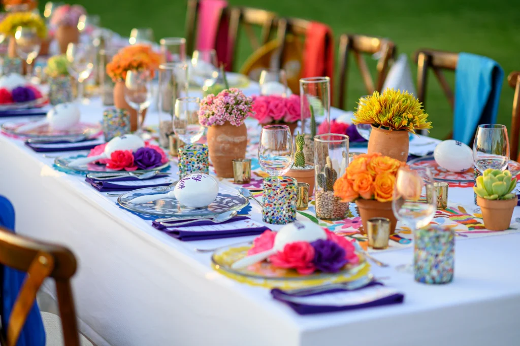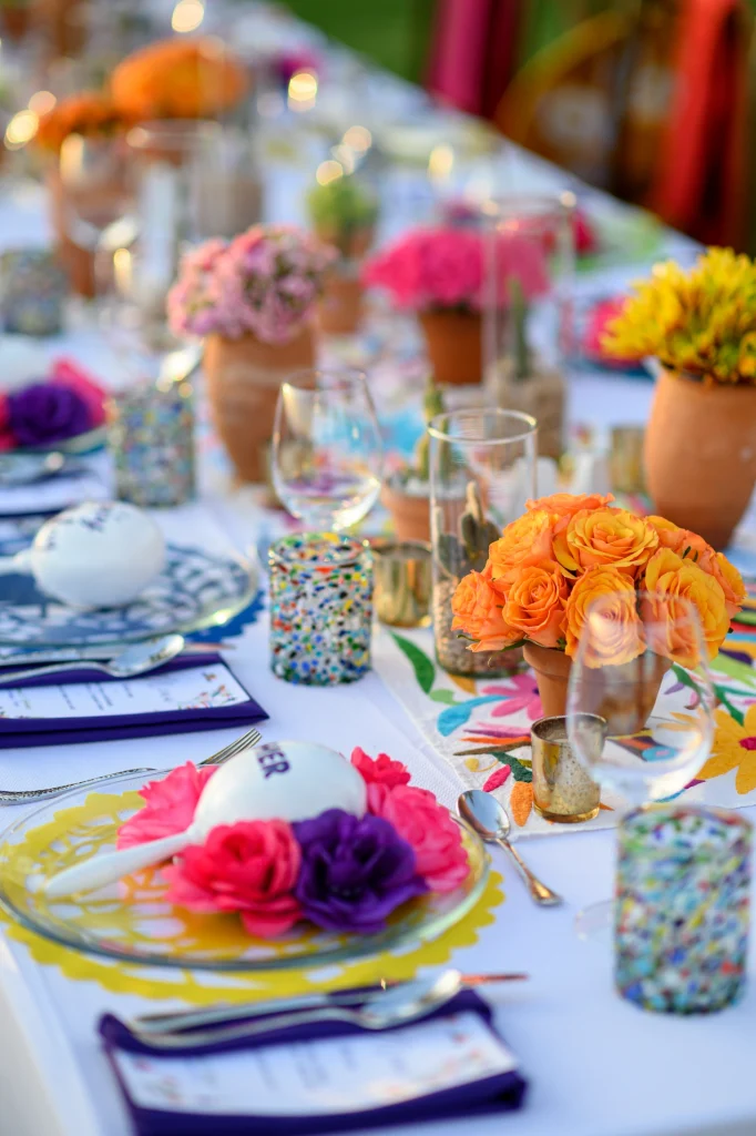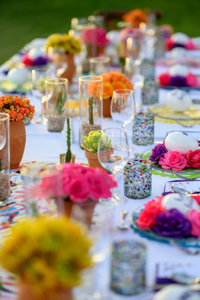 Macetas de barro con flores en tonos intensos, centros de mesa con cactus y maracas pintadas a mano crearon un ambiente lleno de encanto y sabor local.
