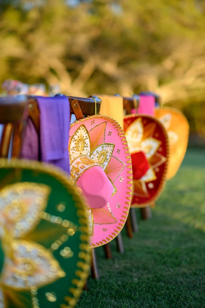 Una mesa larga bajo guirnaldas de luces se decoró con manteles individuales de papel picado, vasos de vidrio soplado y sombreros de mariachi en cada silla.