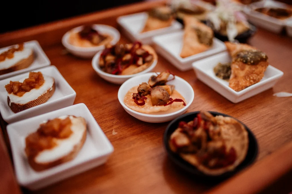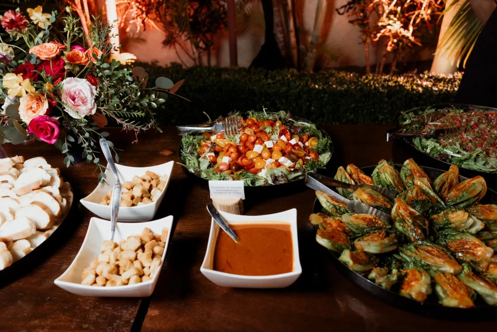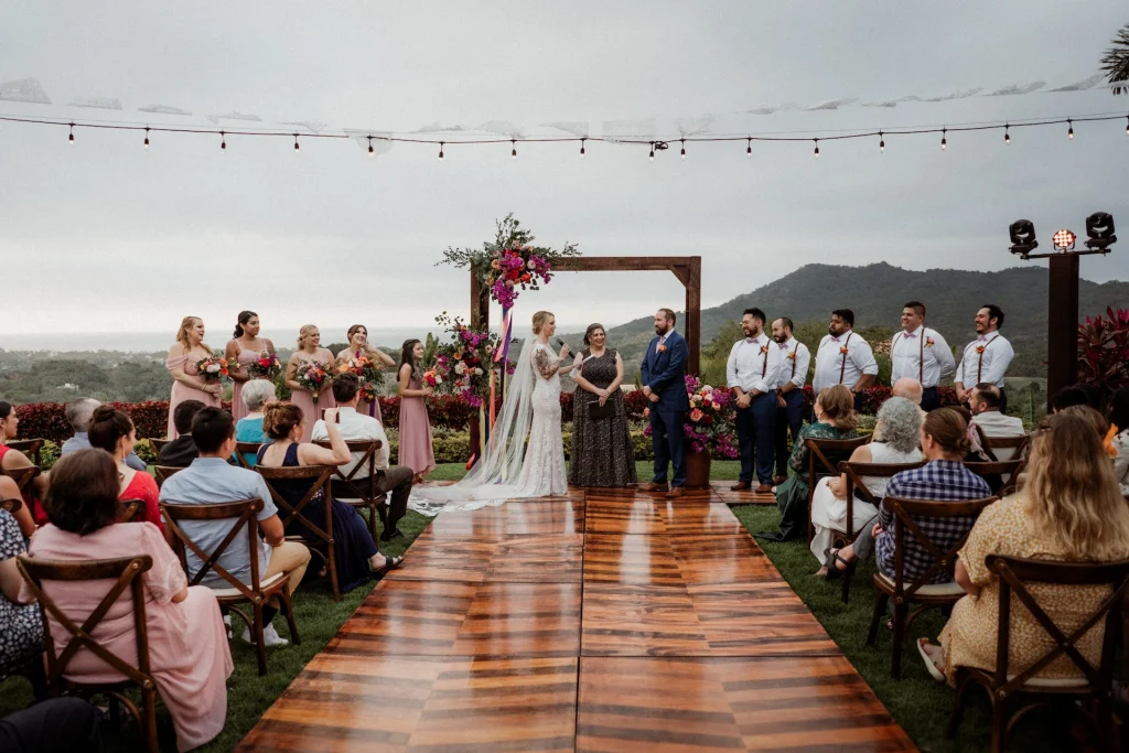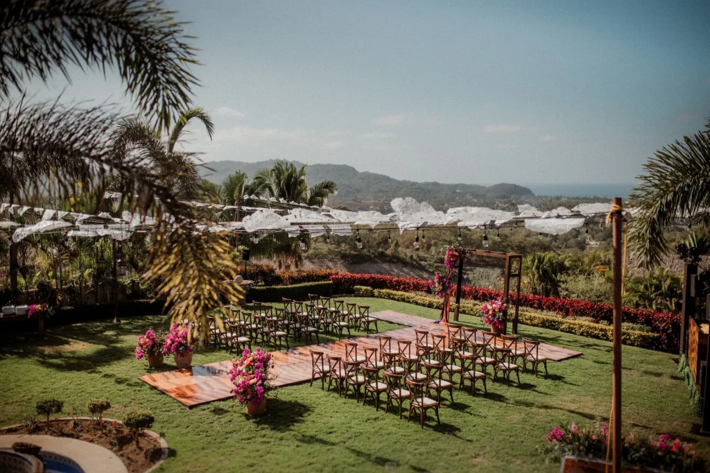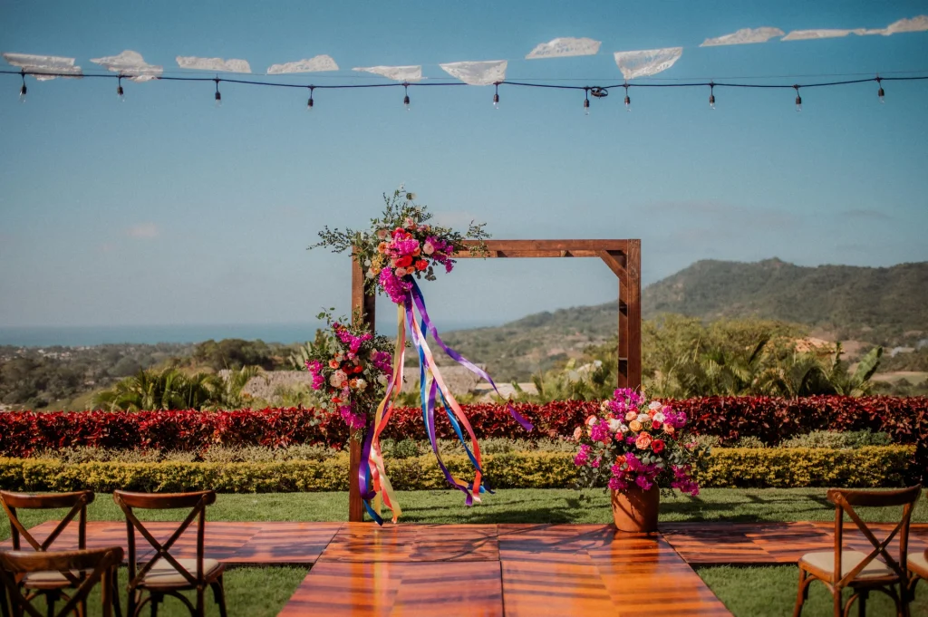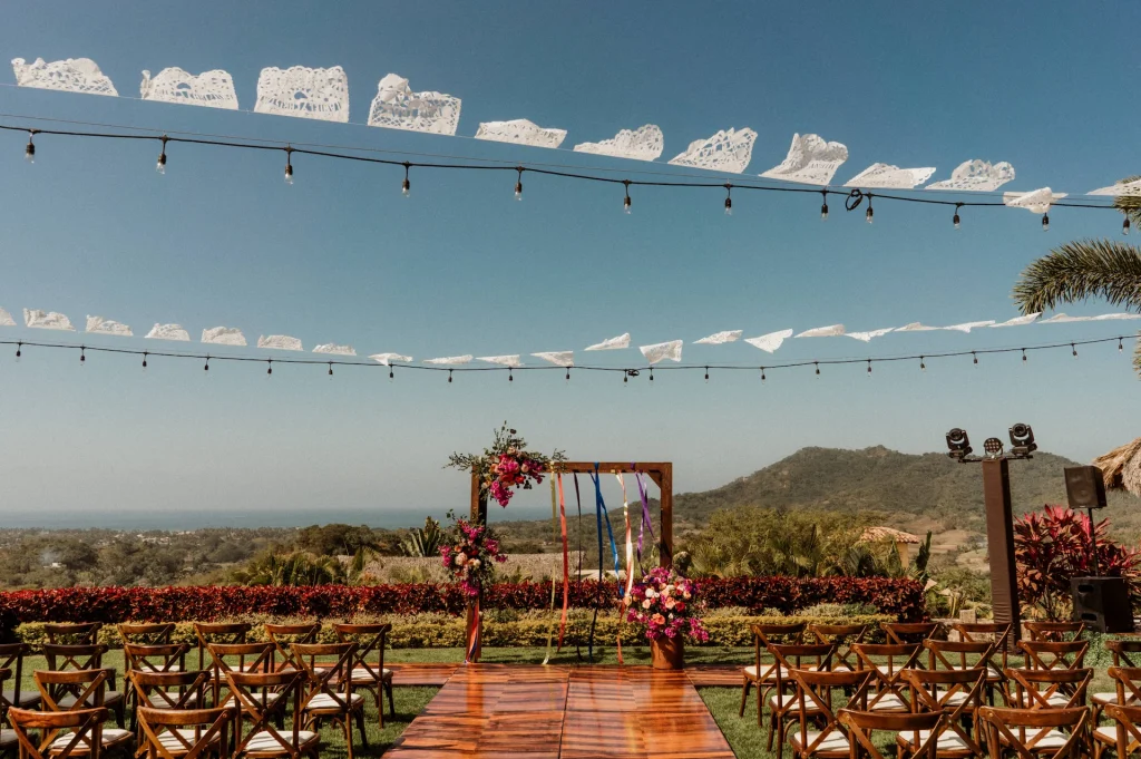 Their ceremony featured bougainvillea-filled clay pots and a wooden aisle leading to a gazebo adorned with vibrant blooms, all framed by personalized white papel picado floating in the breeze. The reception continued the warm and rustic atmosphere, with the gazebo repurposed as the backdrop for their sweetheart table. Wooden tables dressed with candles and lush centerpieces set the mood, while a dessert table with arroz con leche, tres leches cake, and other Mexican favorites added a sweet final touch to a heartfelt celebration.