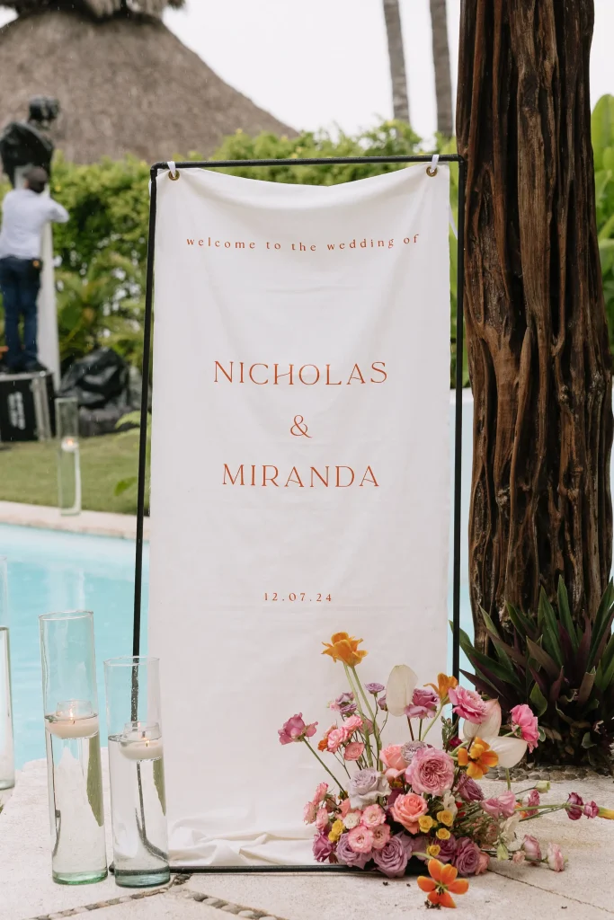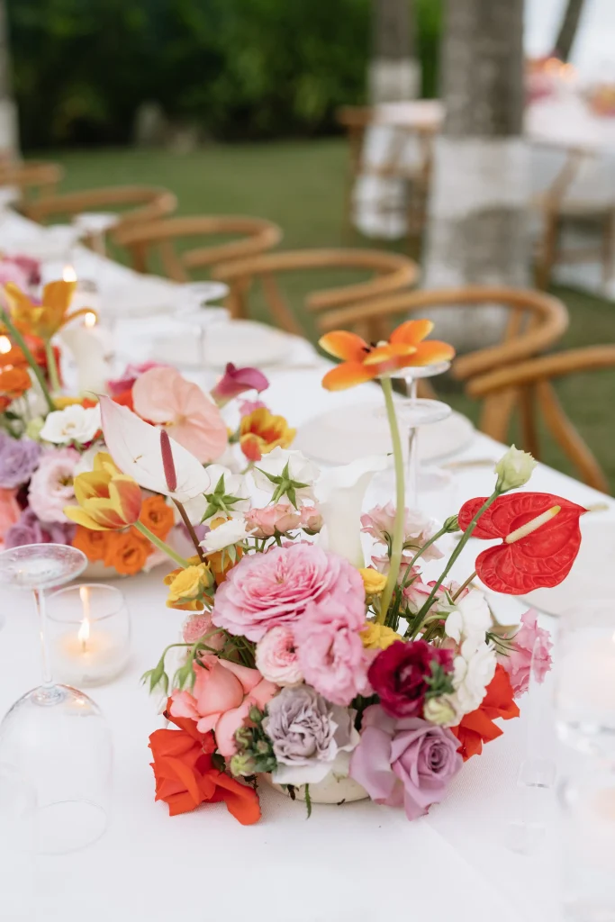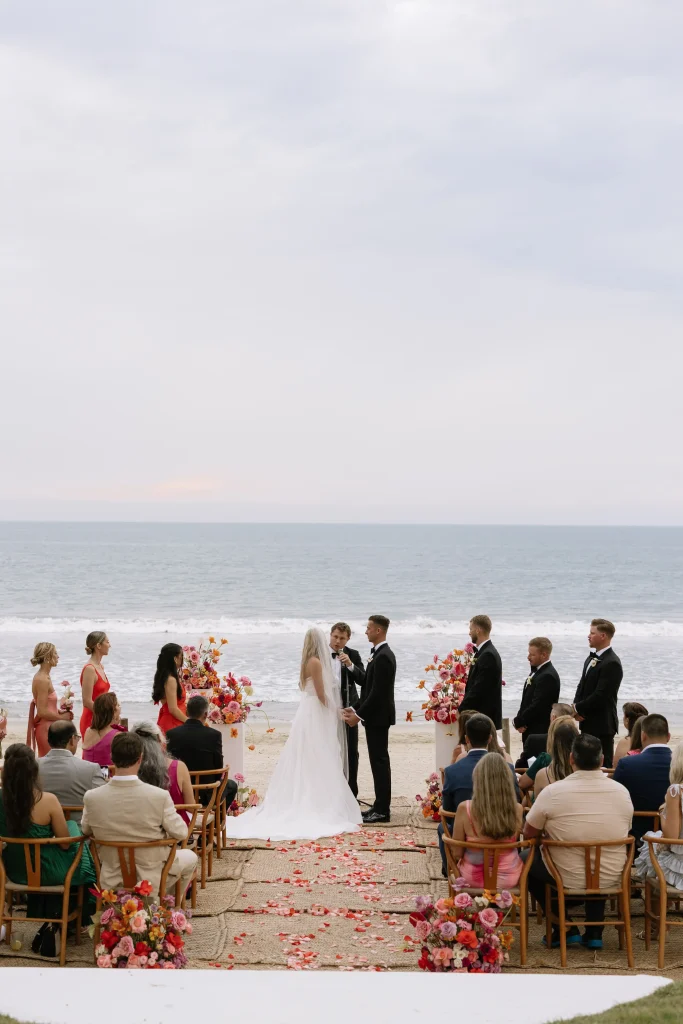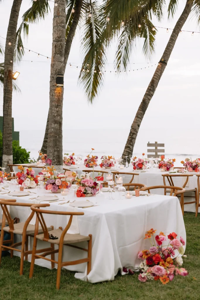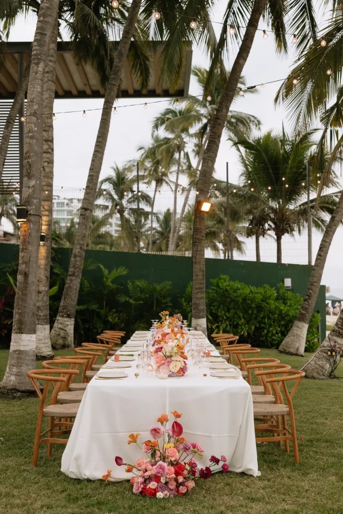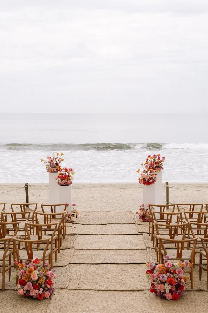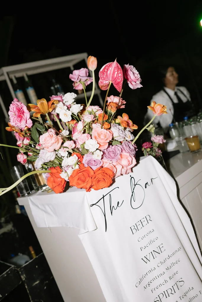 They exchanged vows just steps from the ocean, surrounded by vivid blooms in pink, coral, and orange, creating a stunning contrast against the soft tones of sand and sea. Guests moved seamlessly into cocktail hour, where colorful drinks, local flavors, and a tequila shot seating wall brought energy and fun. The celebration continued under the palms with a cozy dinner setup full of floral touches and meaningful details. From their emotional first dance to late-night desserts and nonstop dancing, every part of their day felt deeply personal and full of joy.