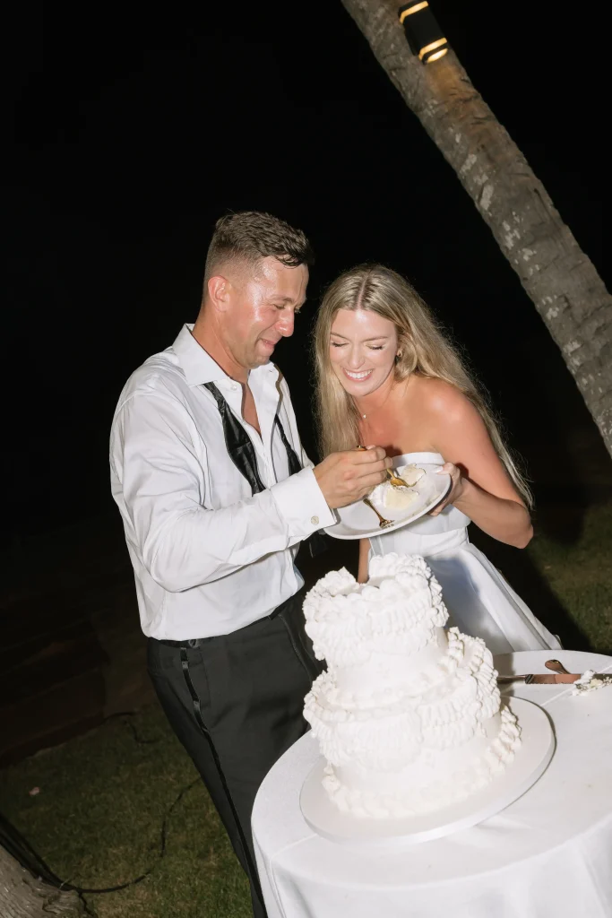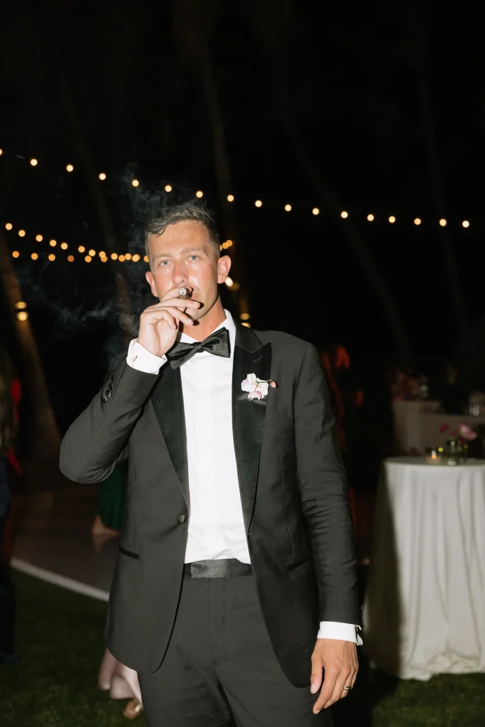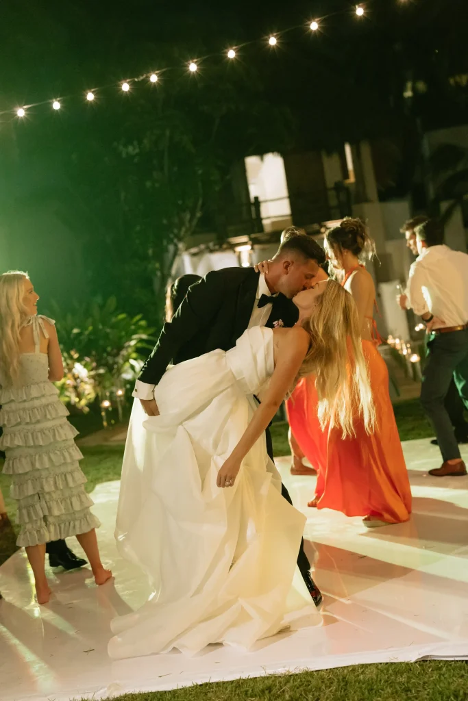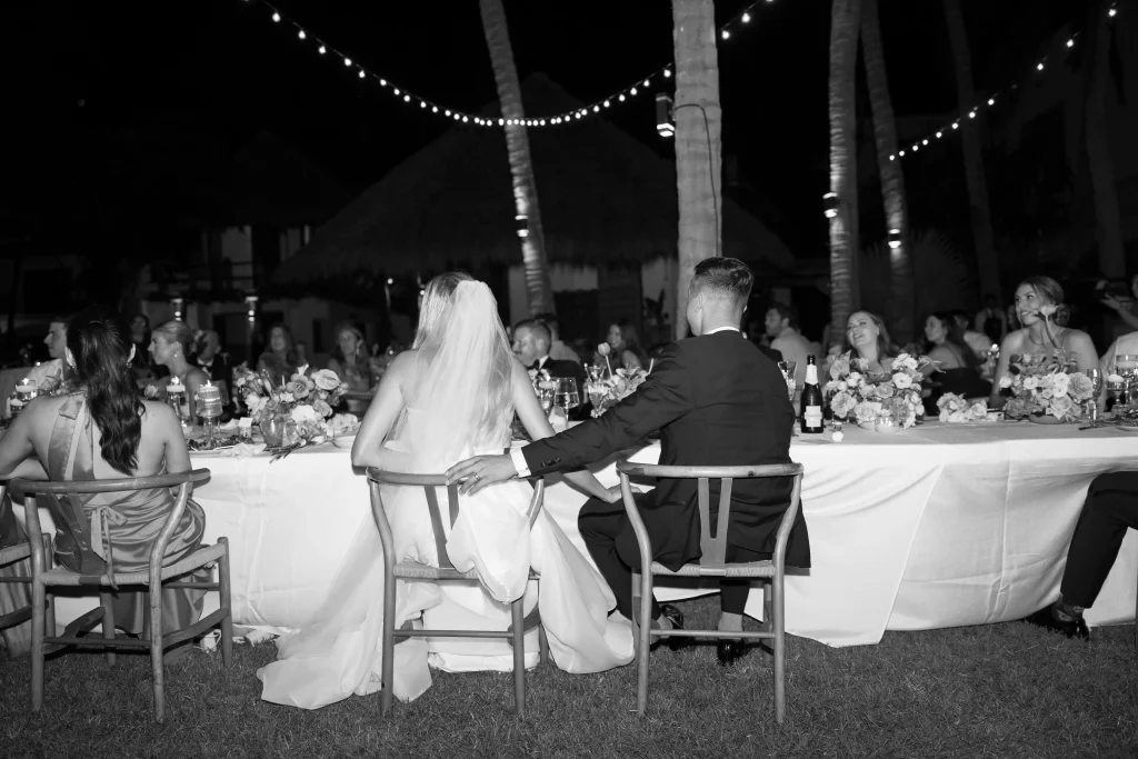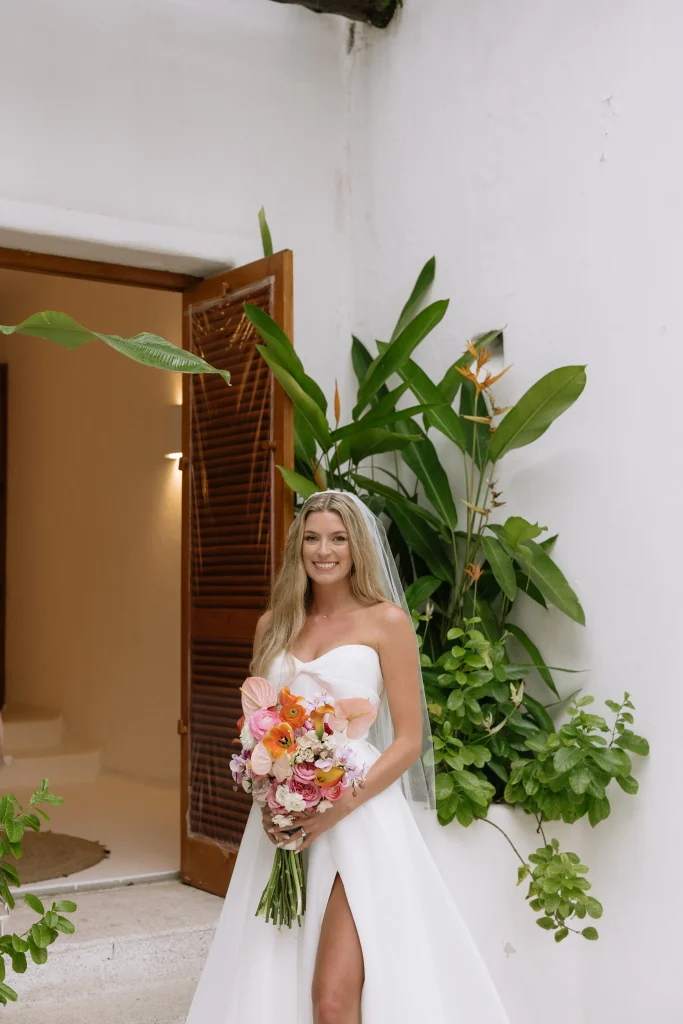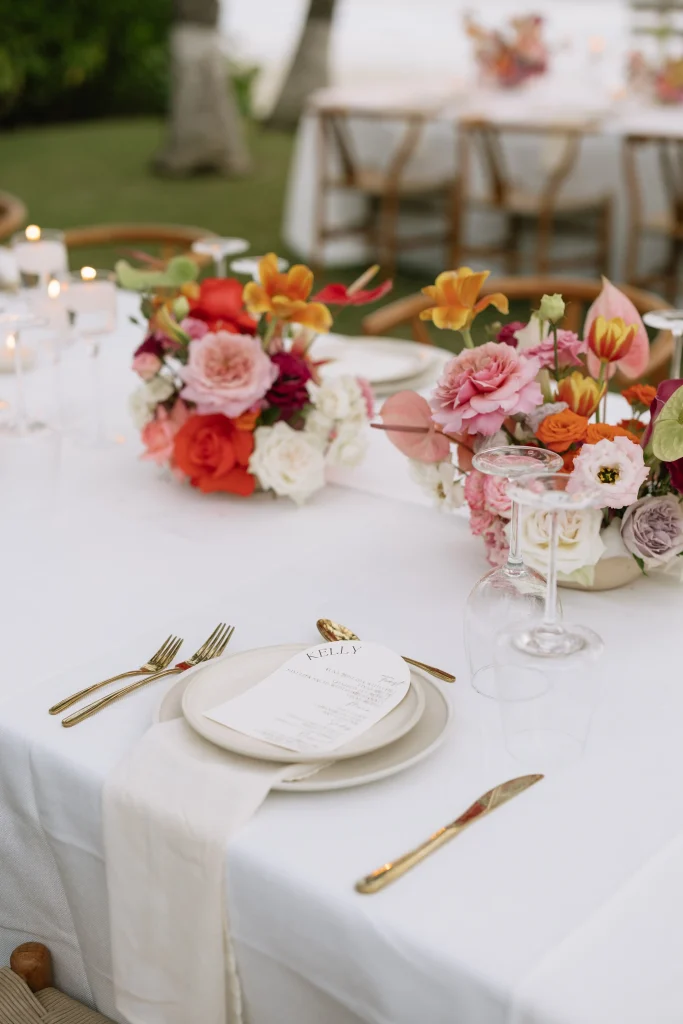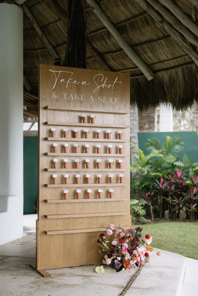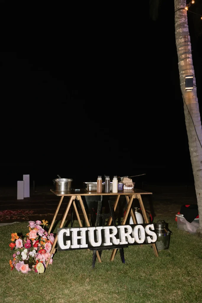 They exchanged vows just steps from the ocean, surrounded by vivid blooms in pink, coral, and orange, creating a stunning contrast against the soft tones of sand and sea. Guests moved seamlessly into cocktail hour, where colorful drinks, local flavors, and a tequila shot seating wall brought energy and fun. The celebration continued under the palms with a cozy dinner setup full of floral touches and meaningful details. From their emotional first dance to late-night desserts and nonstop dancing, every part of their day felt deeply personal and full of joy.