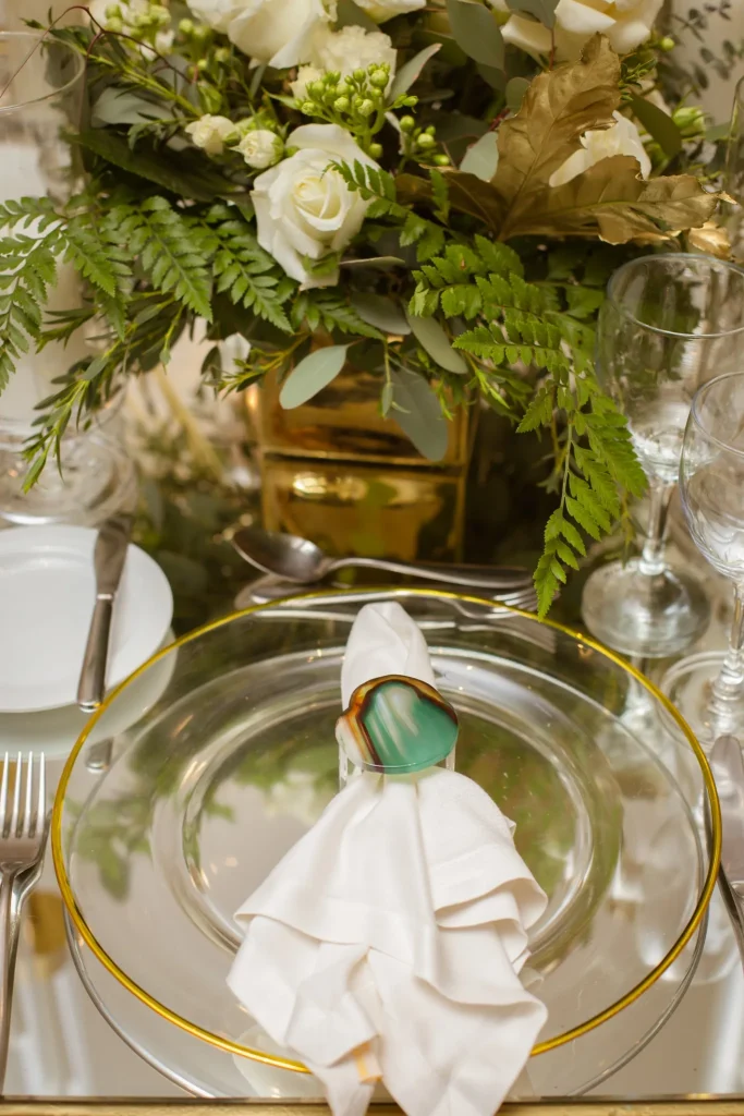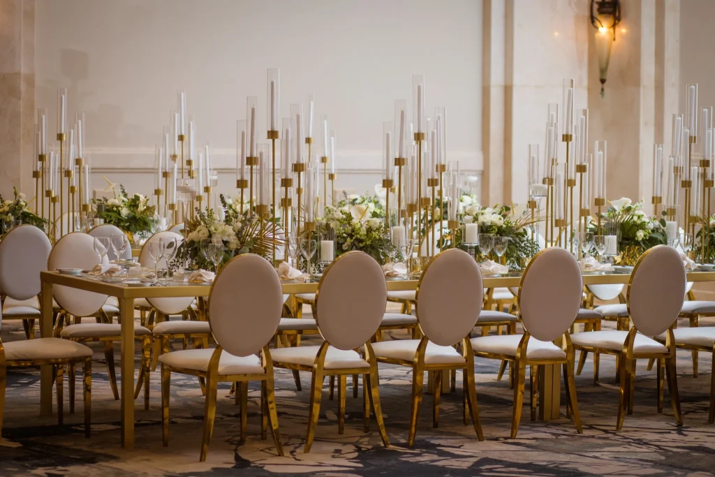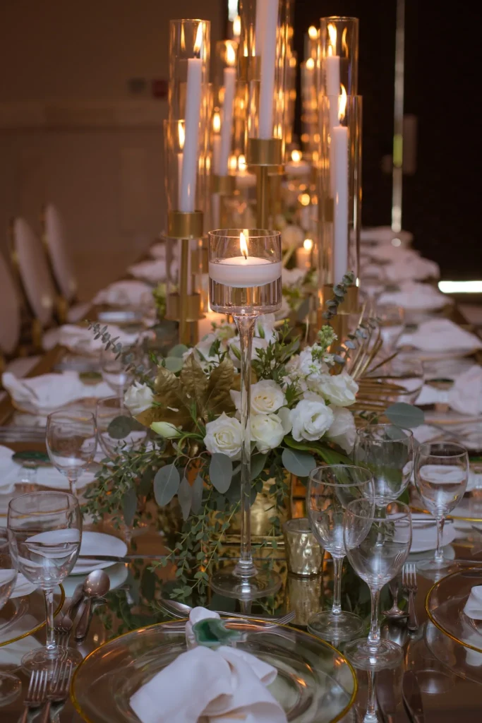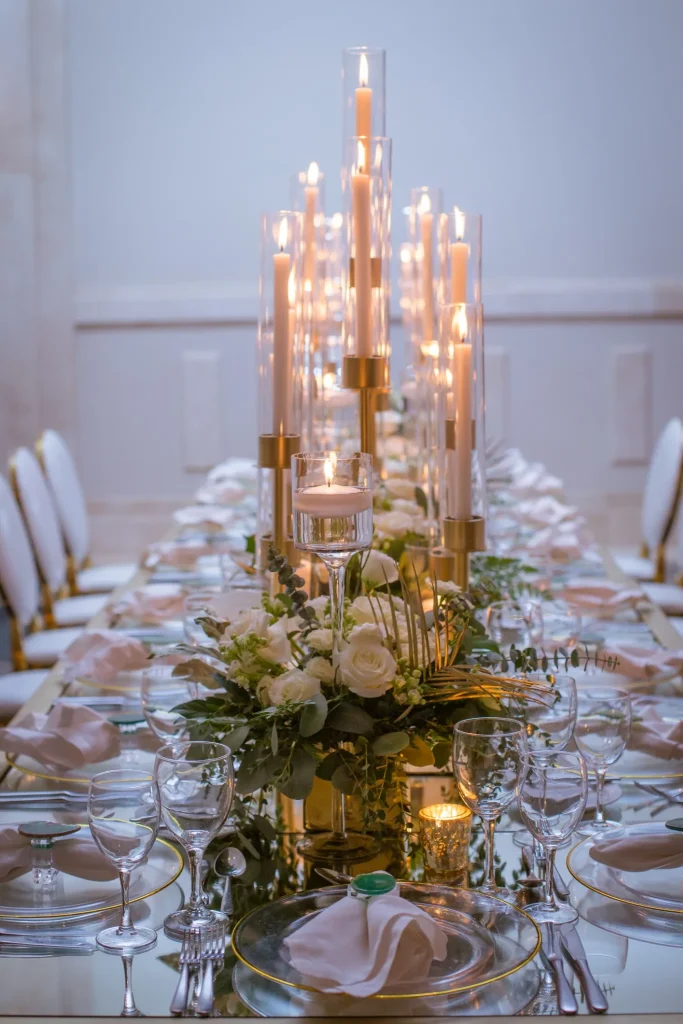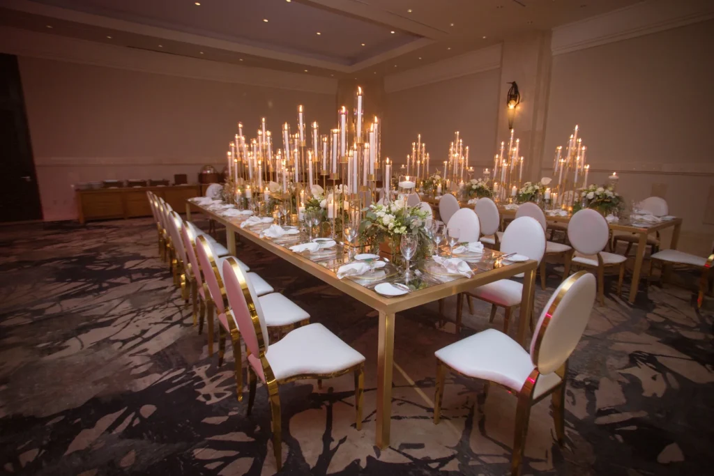 Guests were welcomed to a beautifully styled table adorned with tall candles in chandeliers and lush floral centerpieces. Mirror tables and quartz napkin holders elevated the luxurious ambiance, while a stylish dance floor and balloon backdrop added a festive touch. With her closest friends by her side, Samira’s intimate evening was unforgettable.