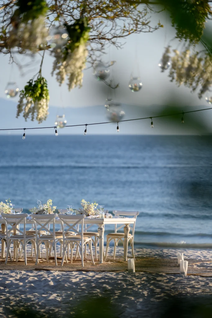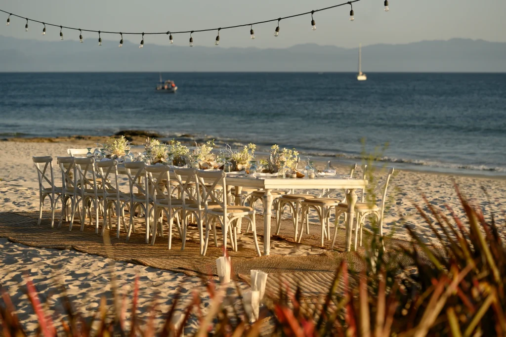 Set directly on the beach, this all-white dinner was the definition of coastal elegance. Guests followed a woven mat aisle to a long white table placed over a carpeted deck. Transparent plates revealed the custom menu underneath, while coconuts, coral, and white orchids with touches of gold adorned the center. Floating candles and flowers hung from a tree where a live music trio played. An unforgettable event styled for a luxury gathering in Punta de Mita.